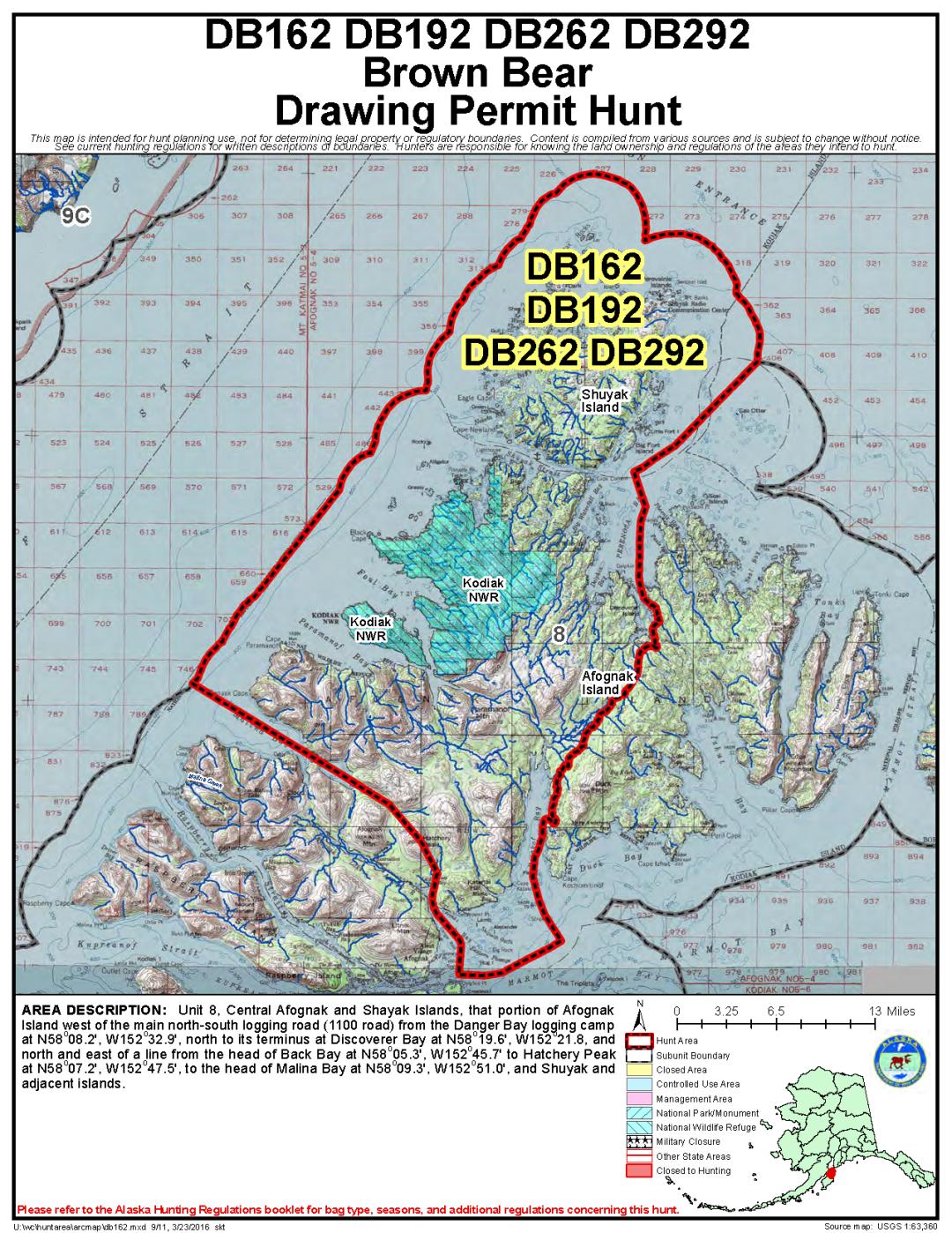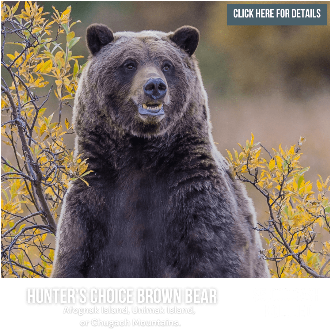 The winner will choose ONE of the following permits: Afognak Island all zones brown bear (SB161-163), Unimak Island brown bear (SB377) or Chugach Mountains brown bear (SB470).