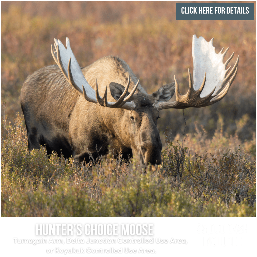 The winner will choose ONE of the following permits: Turnagain Arm any bull moose (SM210), Delta Junction Management Area Moose (SM790) or Koyukuk Controlled Use Area Moose (SM823-830).