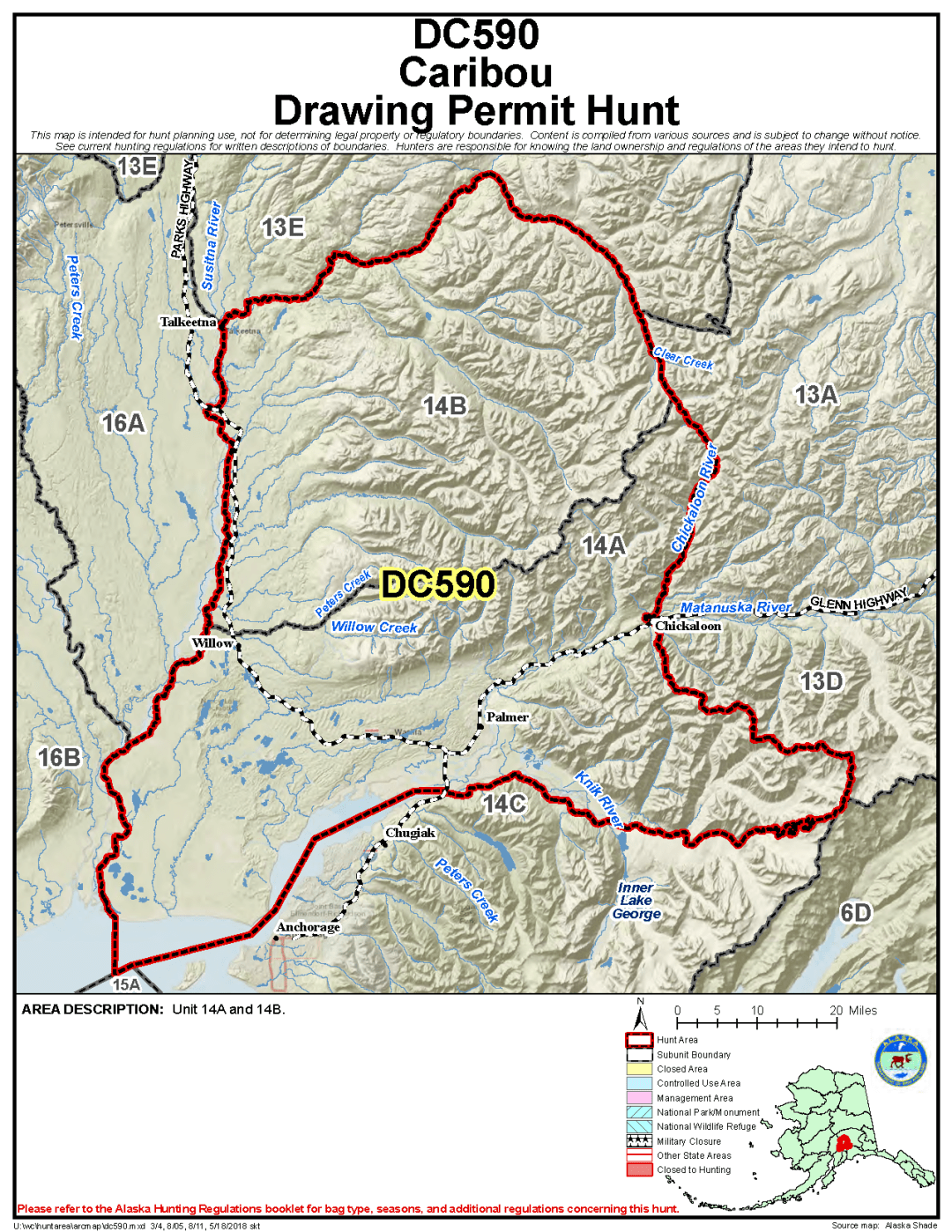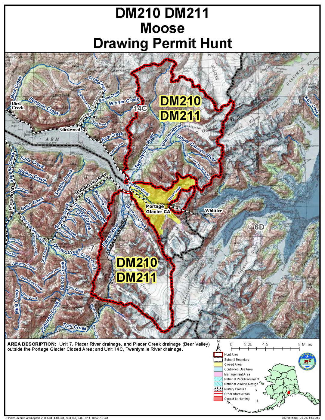 You can hunt area by boat from the Twentymile or Placer Rivers, on foot or by aircraft.