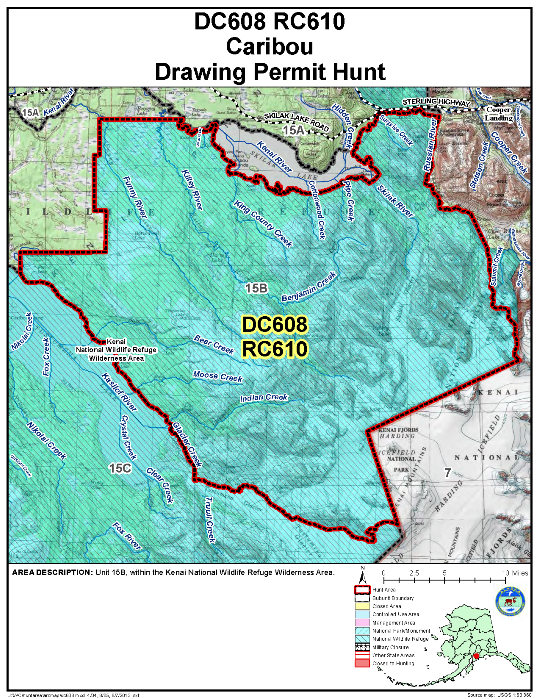 The Killey River caribou herd is located within the Kenai National Wildlife Refuge. The herd is challenging to access, and the best method is usually horseback with limited locations for aircrafts to land within the refuge. Although challenging, hunters who can get into the zone usually can be selective with their caribou harvest.